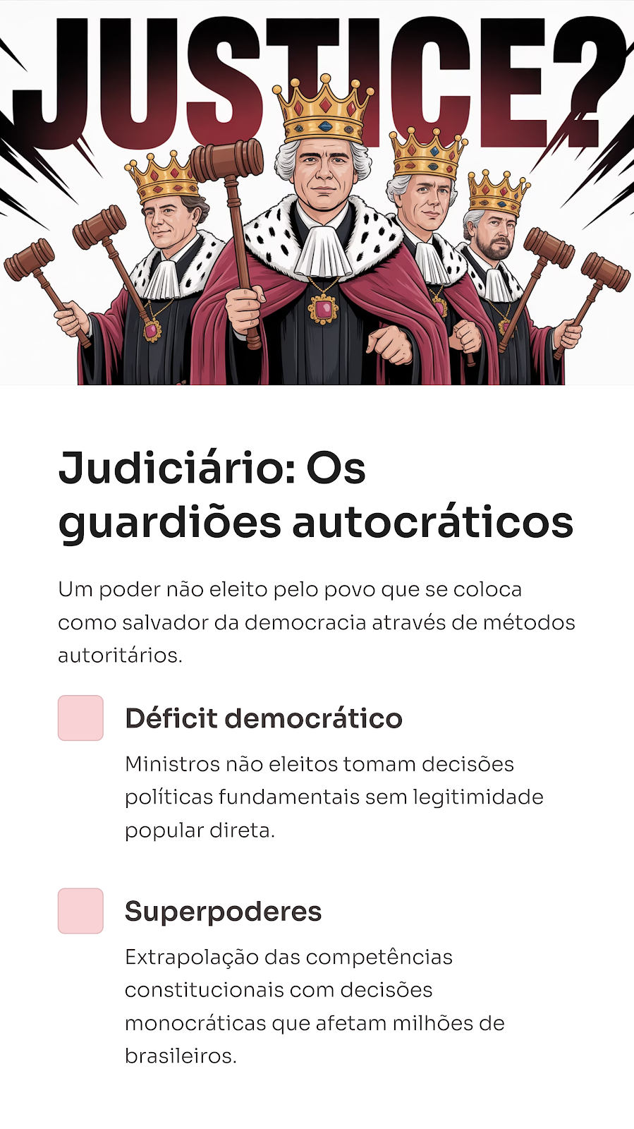 2. Superpoderes: Extrapolação das competências constitucionais com decisões monocráticas que afetam milhões de brasileiros.